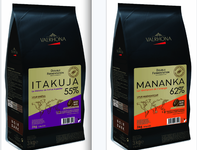 Initially, Valrhona has worked with two plantations yielding two distinctive Double Fermented products: Itakuja 55%, a Pure Brazilian couverture fermented with passion fruit and Mananka 62%, a Pure Madagascan couverture fermented with citrus.