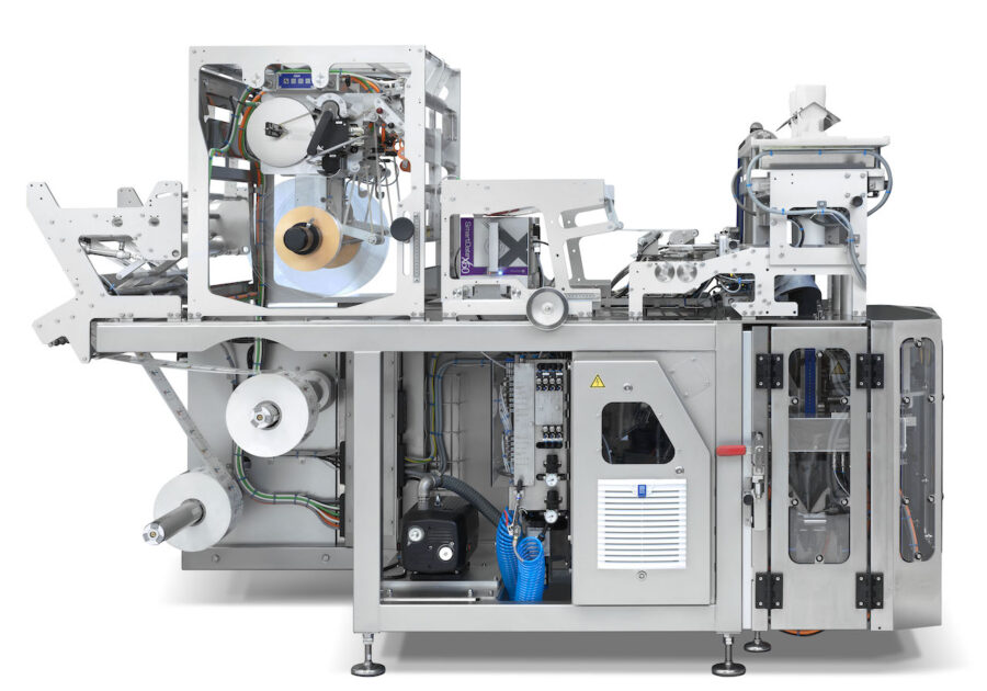 The line operates with two parallel forming tubes, achieving combined speeds of up to 500 bags per minute (weighing 10 to 18 g each). It is also possible to run a different film reel for each tube, meaning calorie packs of different widths or designs can be simultaneously filled. A new feature to the machine is the Jumbo Roll, which allows film reels of up to 100 kg to be used for long production runs, which boosts operational efficiency.