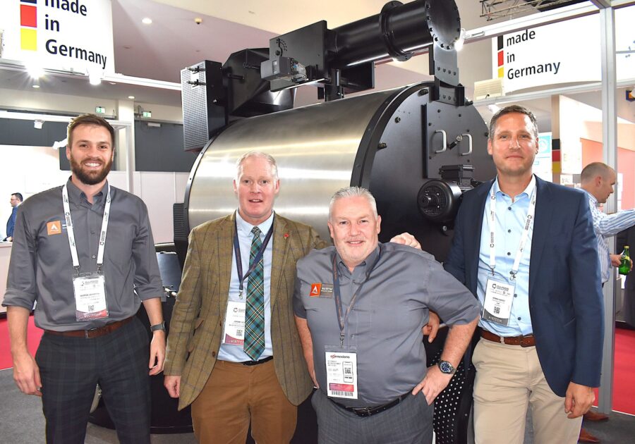 The MacIntyre team joins CEO of HDM, Armin Hardt (right of pic) at a previous Gulfood Manufacturing show. The business is set for a major release this weekend. Pic: Neill Barston