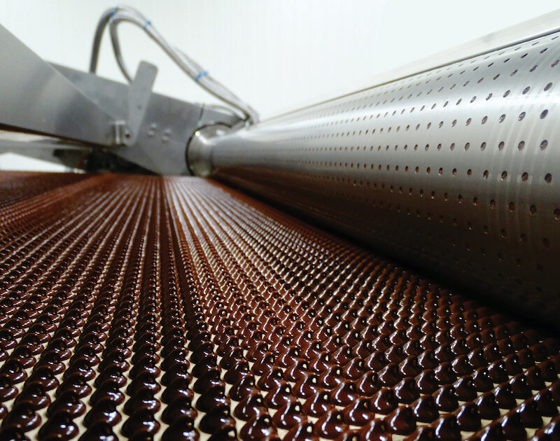 Notably, as the business explained, at the heart of all IPCO’s high capacity systems is the Rotoform, a rotary drop depositor consisting of a heated stator – which is supplied with liquid chocolate – and a perforated rotating shell that turns concentrically to deposit drops of chocolate onto a continuously running steel belt.